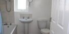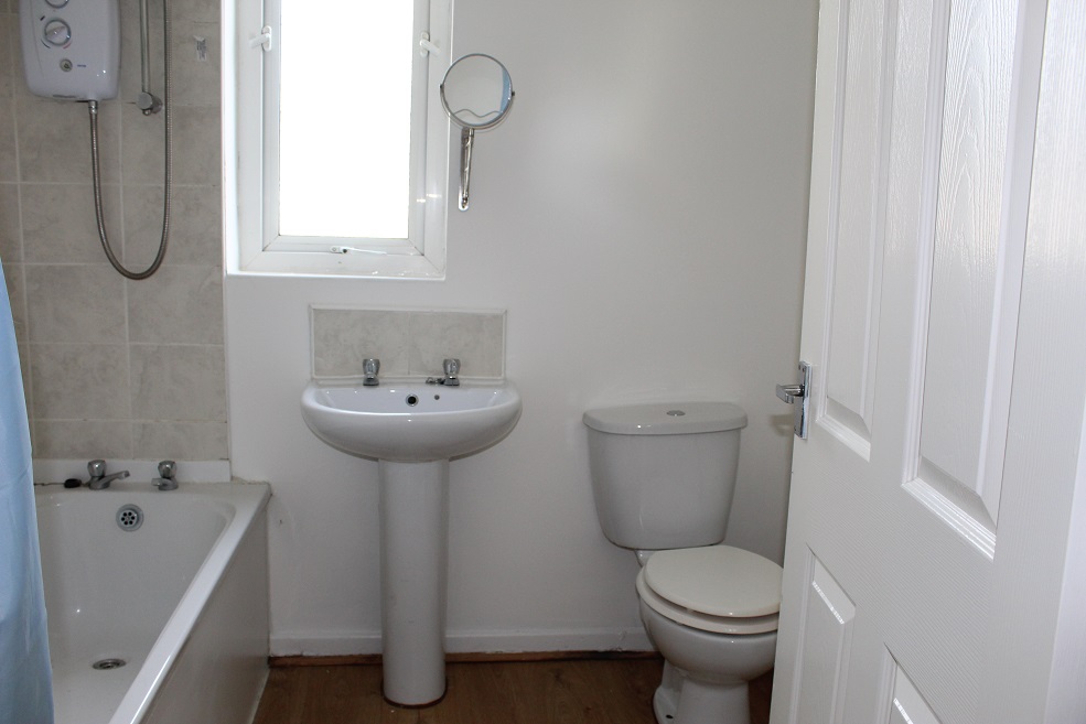 The bedroom is a generously sized double room, offering plenty of space for bedroom furnishings and storage. The bathroom is fitted with a three-piece suite comprising panelled bath with electric shower over, low-level WC, and wash hand basin, finished in neutral décor.